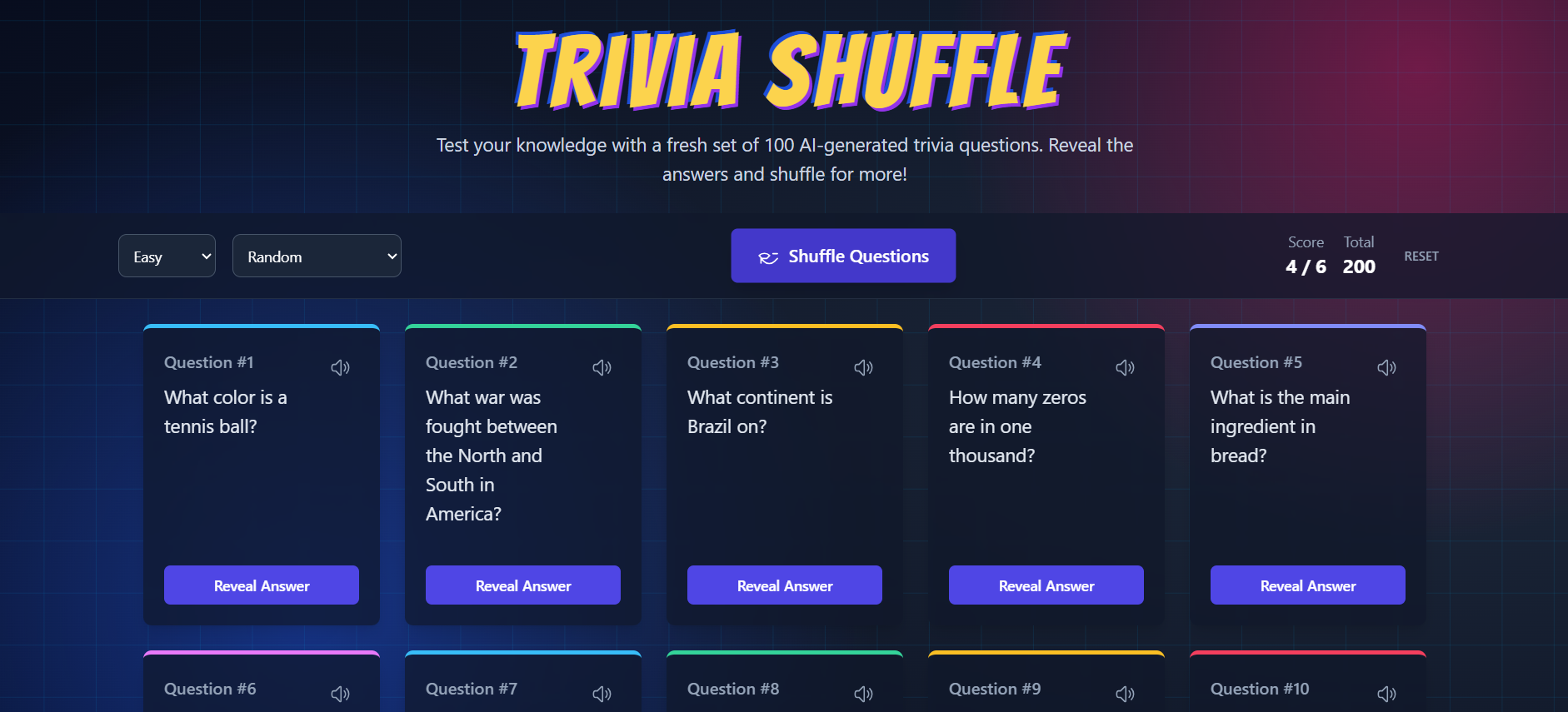Test your knowledge with **Trivia Shuffle** - a sleek, modern trivia game with hundreds of questions across multiple